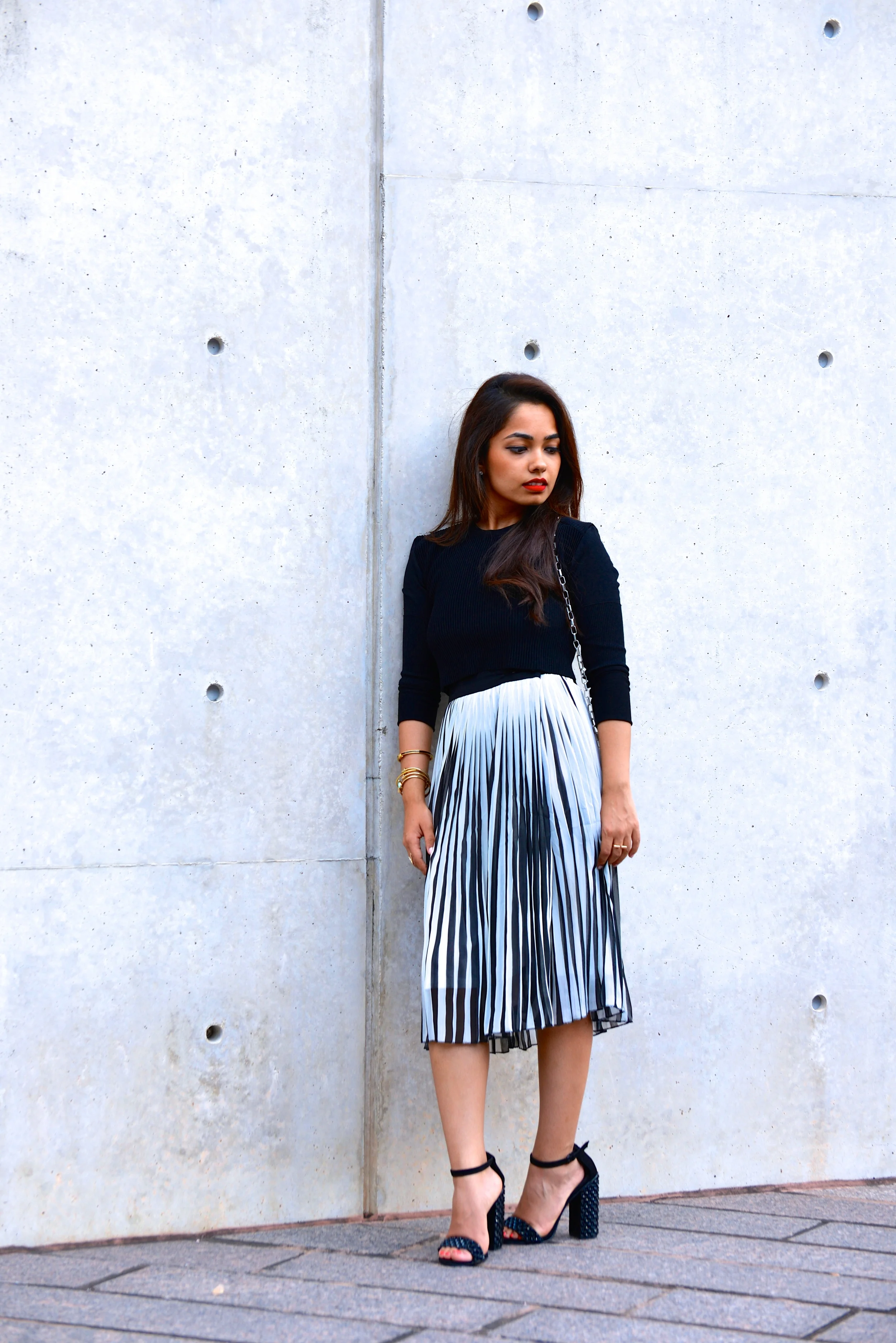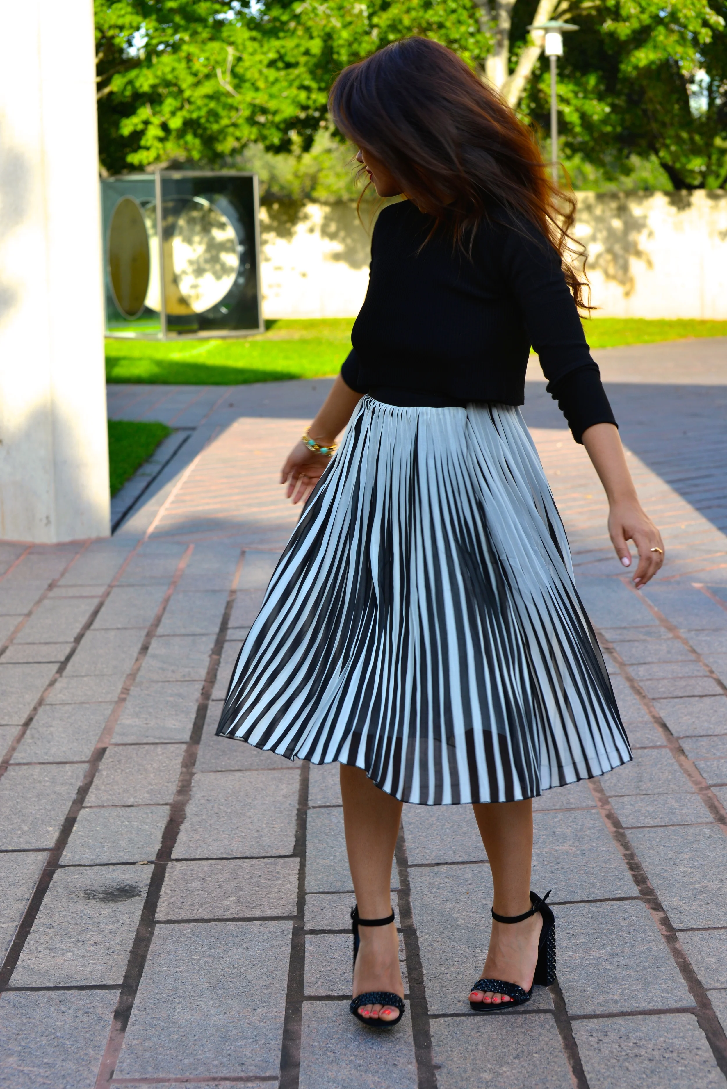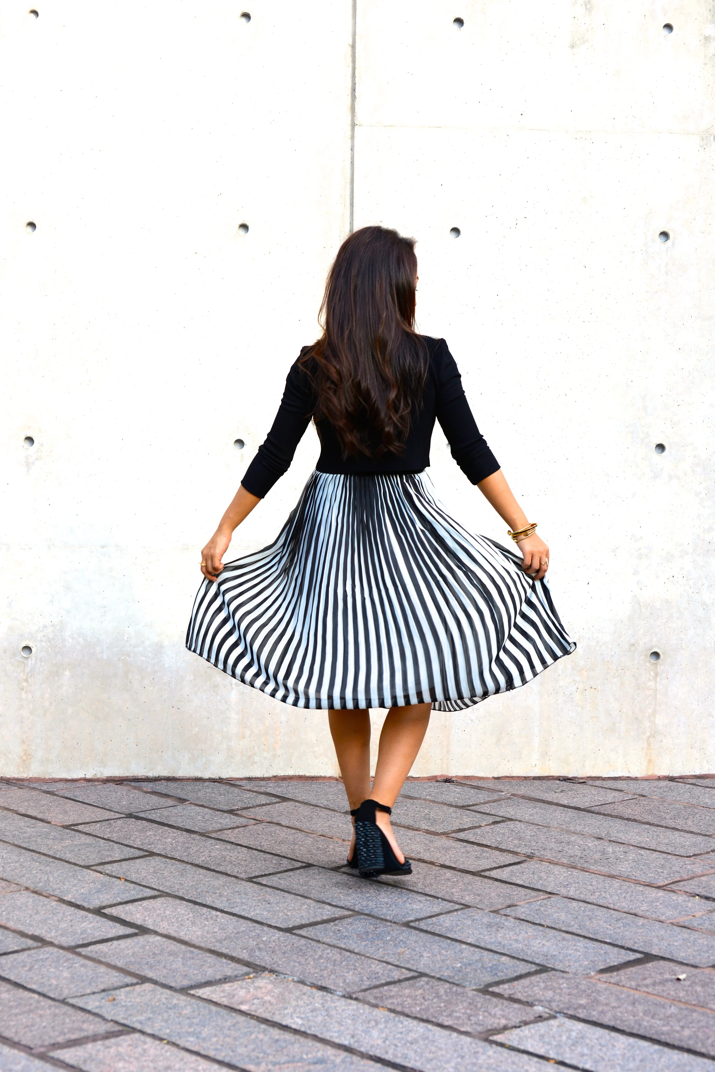 Black and White is one of my favorite go-to color combinations as you can pretty much wear this combo all year around and alter it to fit a day or a night look. One of the main reasons I chose this accordion pleated skirt was because of the black and white vertical stripes, which will make you look taller and slimmer.