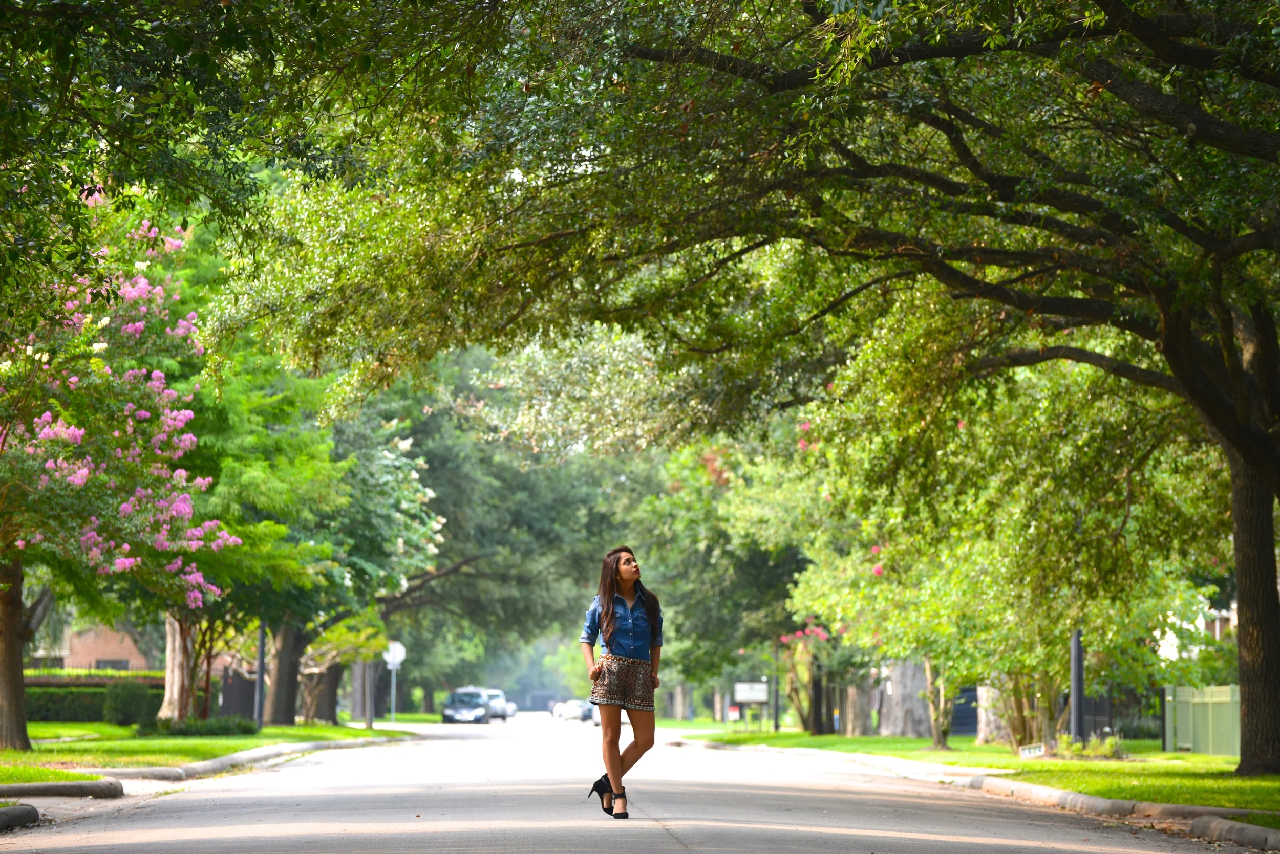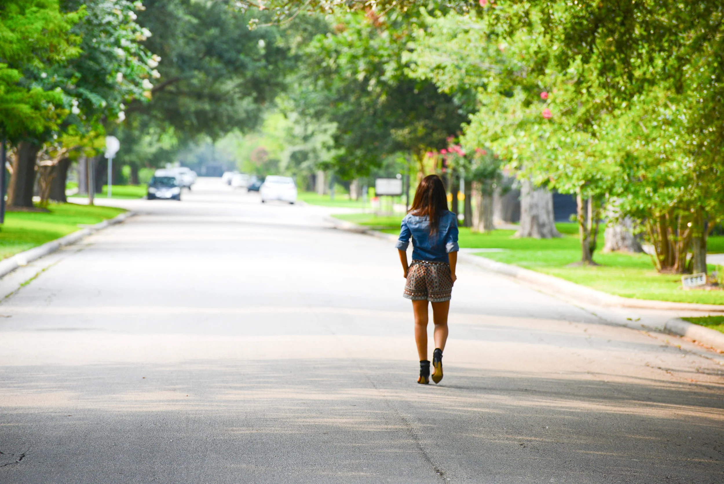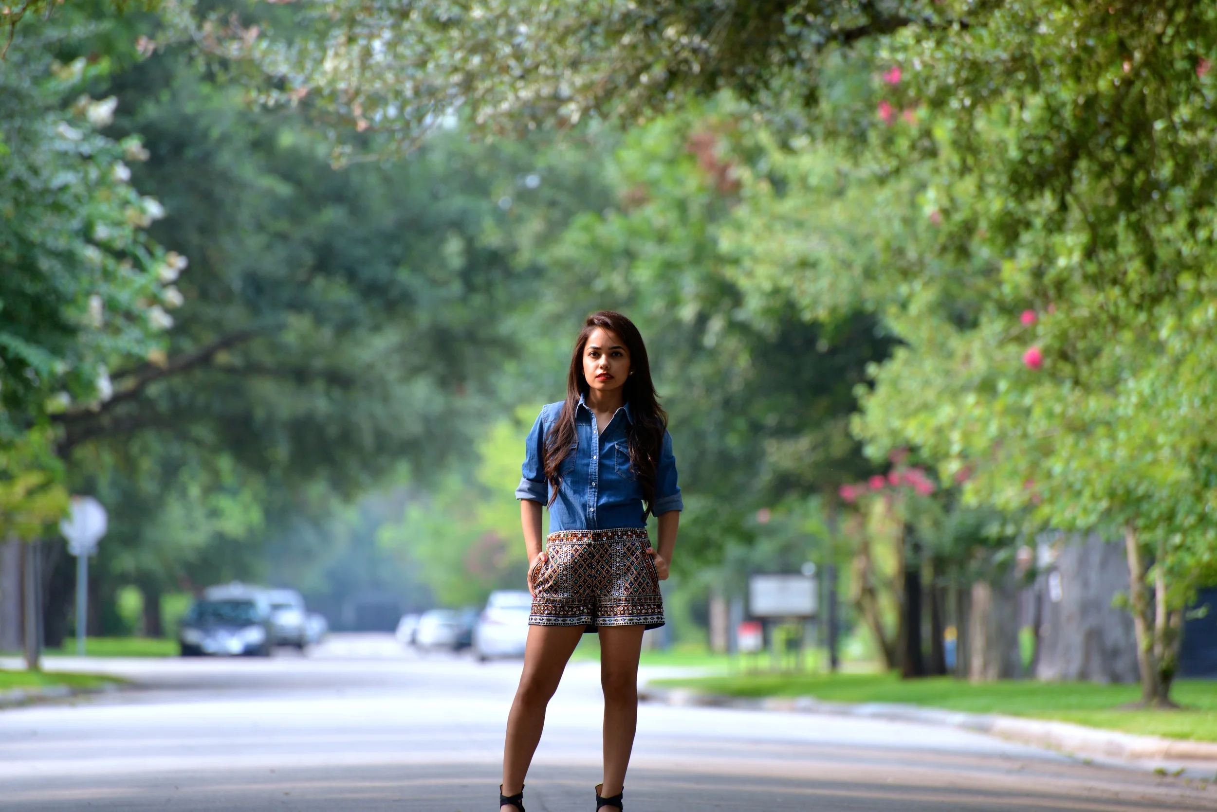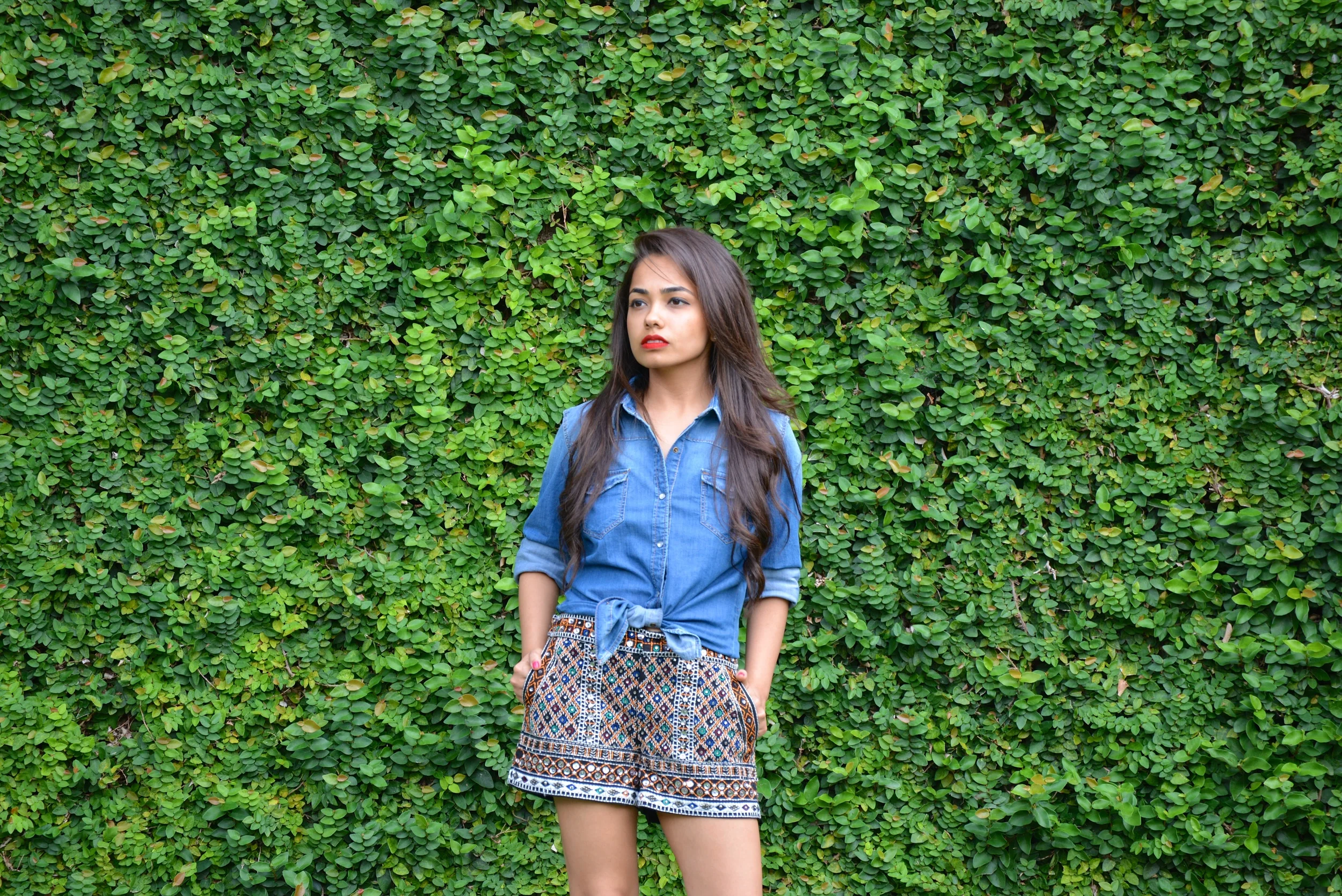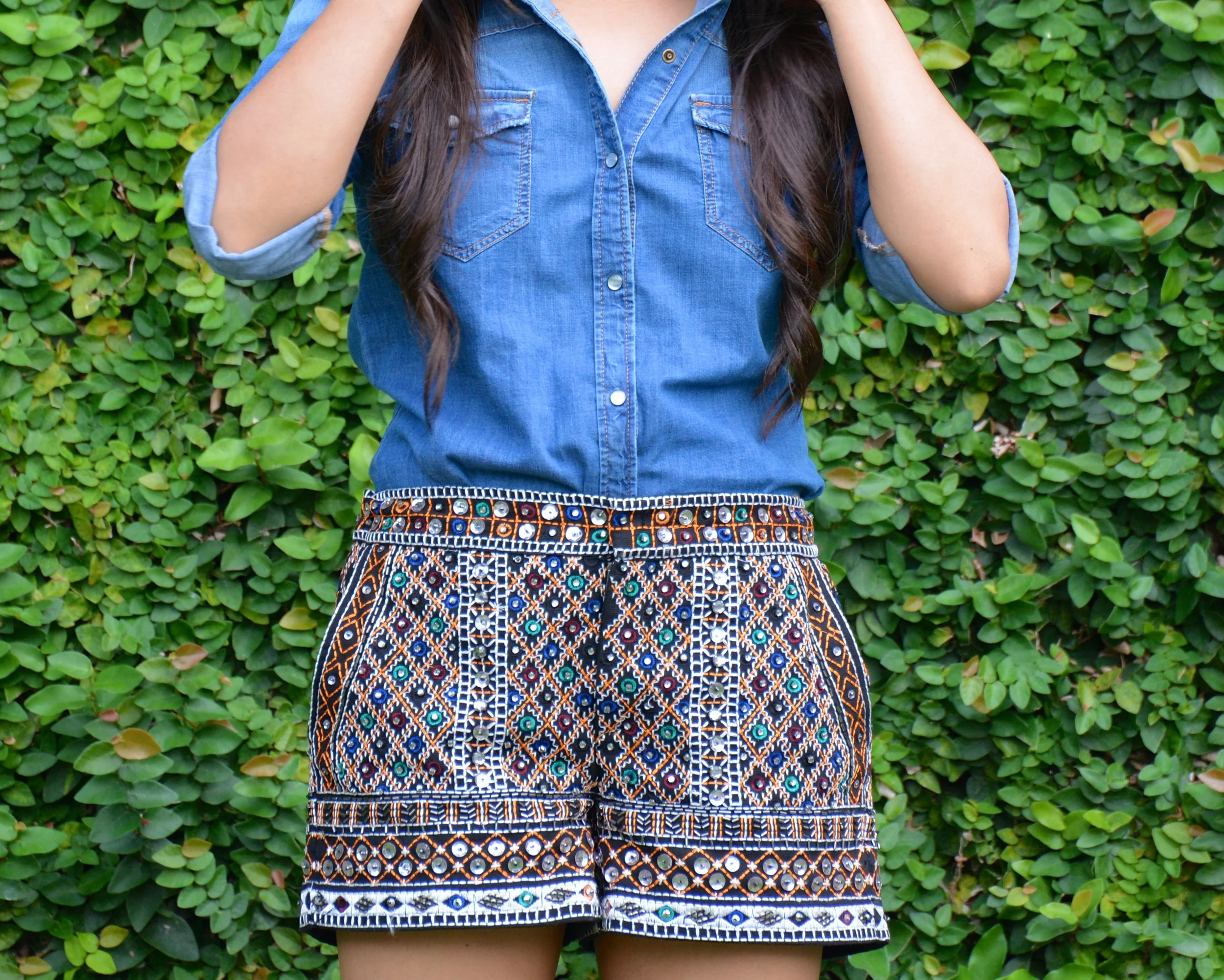 A simple denim top to bring out the colors in the shorts and a red lip to top it all off and the outfit is complete.