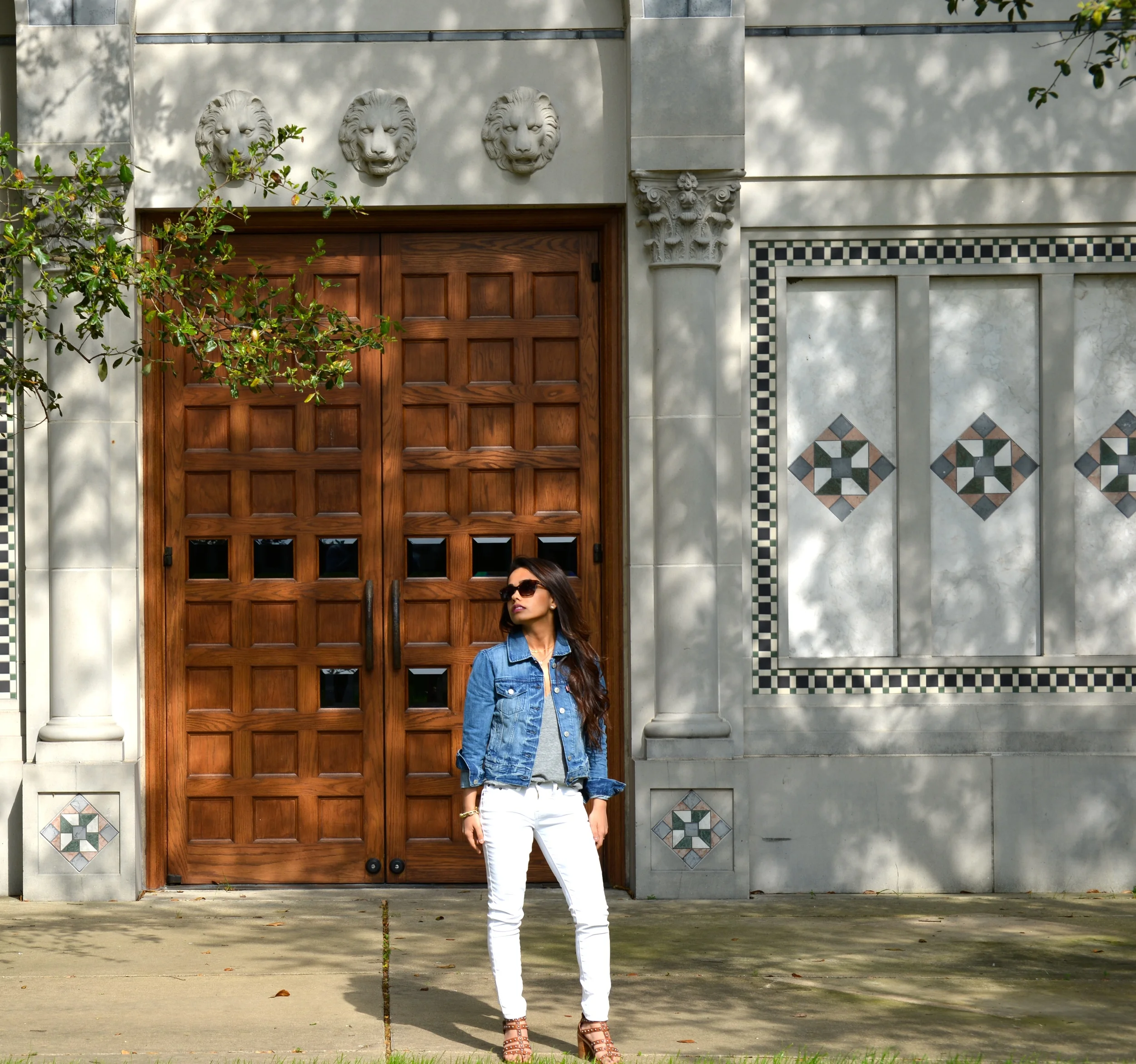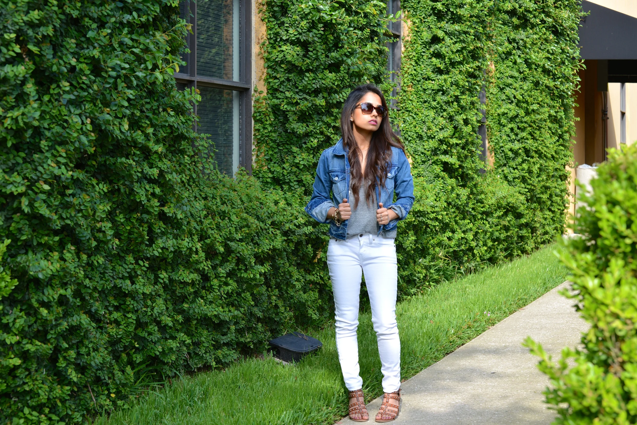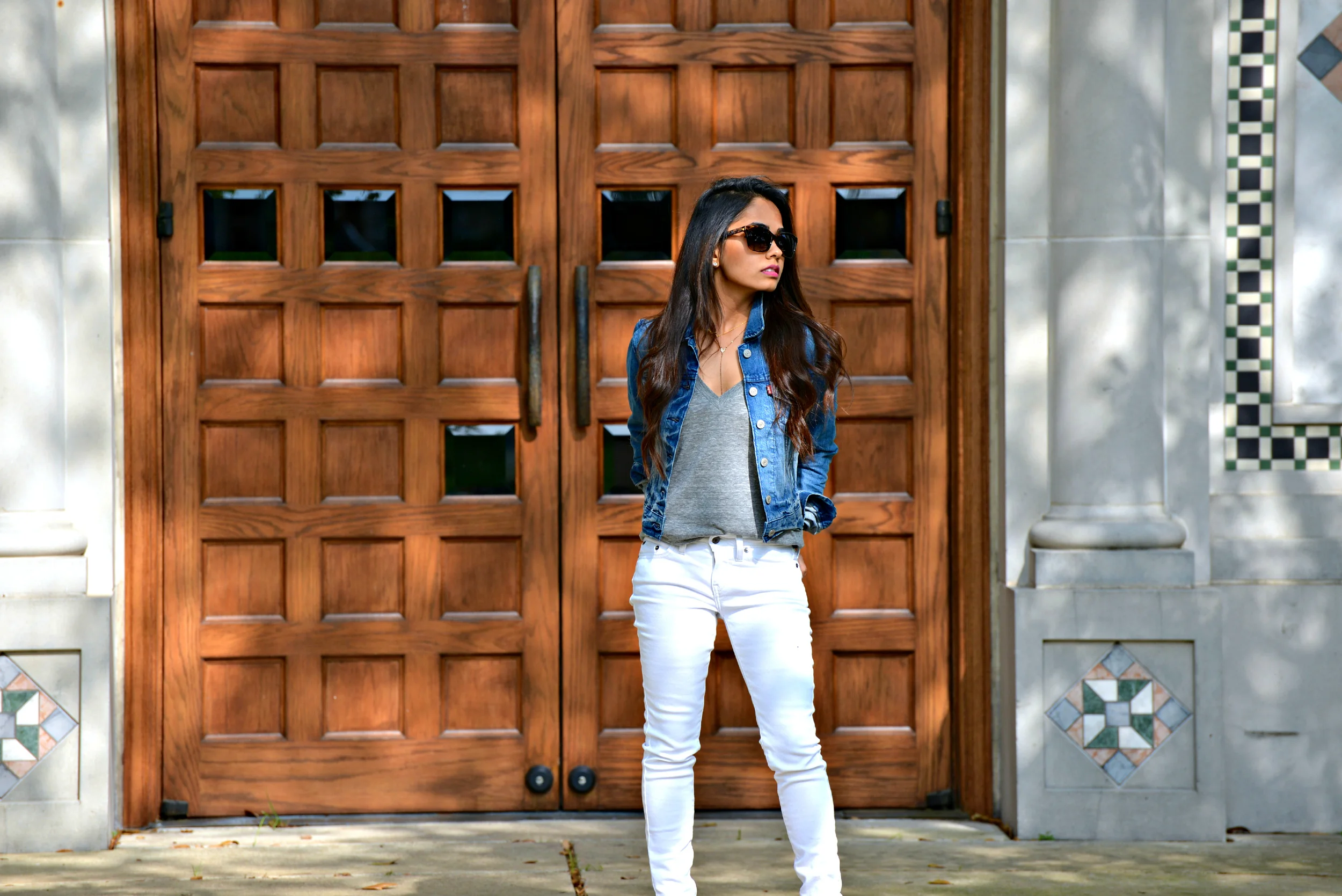 Another classic staple in my closet is a pair (or three) of white jeans. They are so versatile and can be worn in any season! White jeans make an outfit pop and you can dress it up or down anyway you want it. I chose to pair one of my newest white jeans with a plain grey tee and a jean jacket for the perfect spring day outfit.