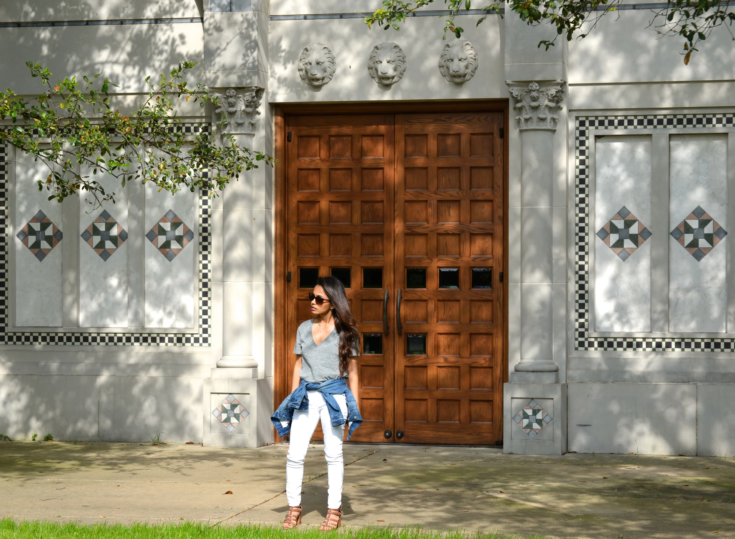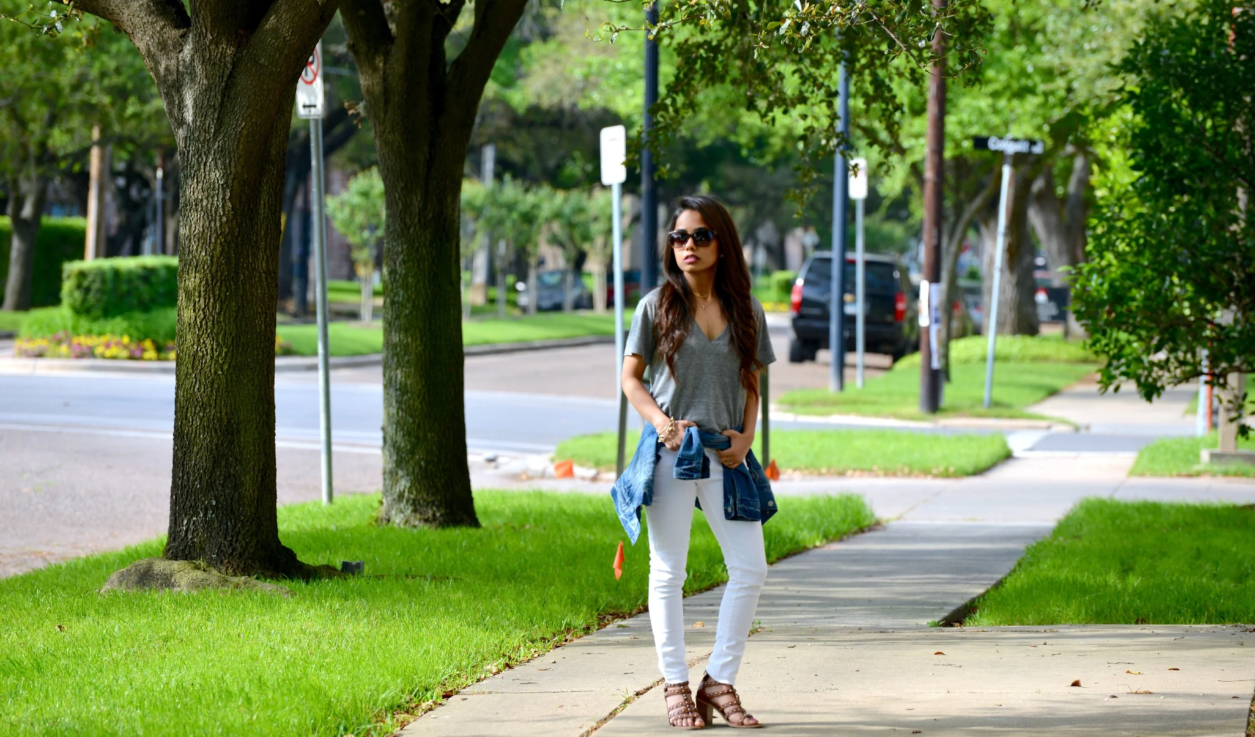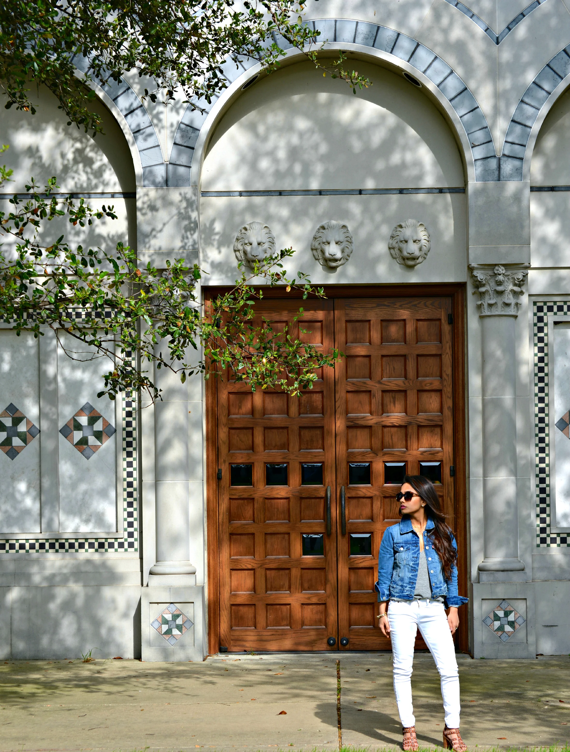 Another classic staple in my closet is a pair (or three) of white jeans. They are so versatile and can be worn in any season! White jeans make an outfit pop and you can dress it up or down anyway you want it. I chose to pair one of my newest white jeans with a plain grey tee and a jean jacket for the perfect spring day outfit.