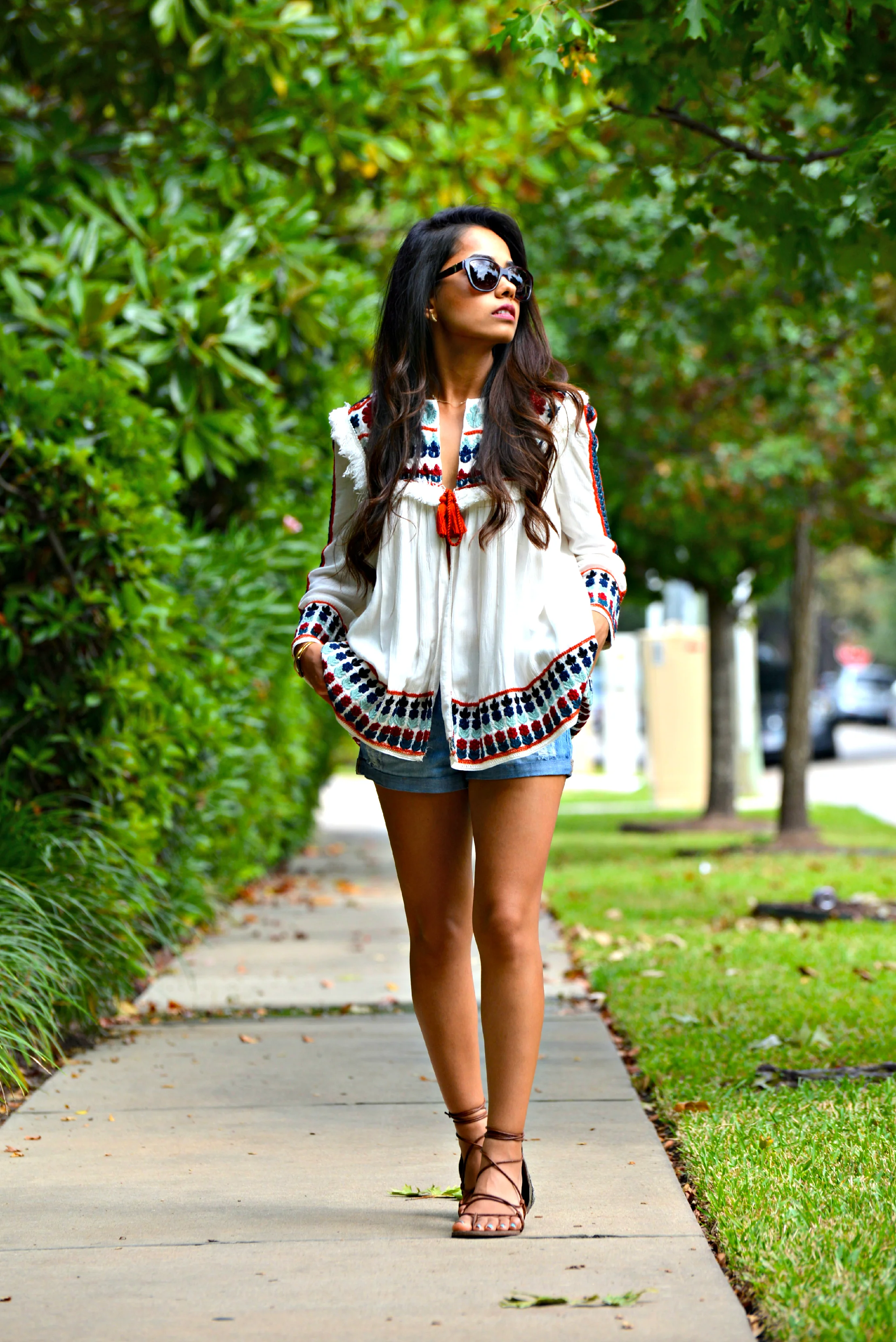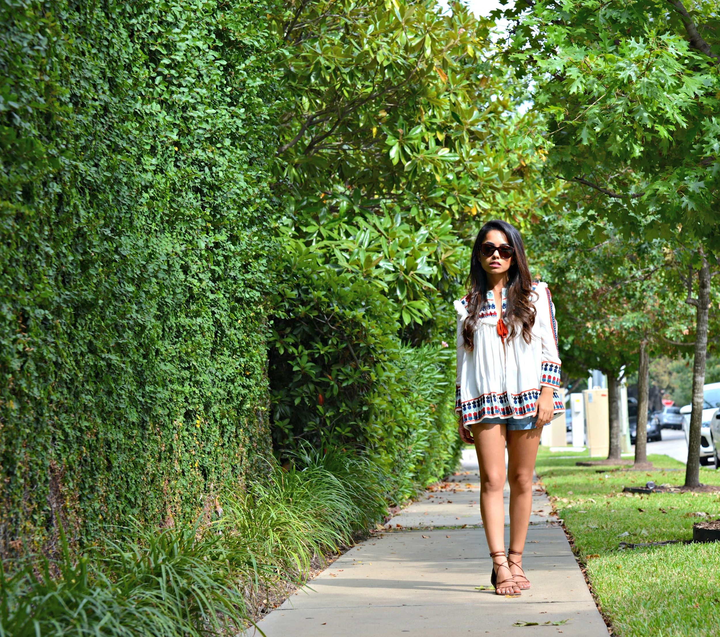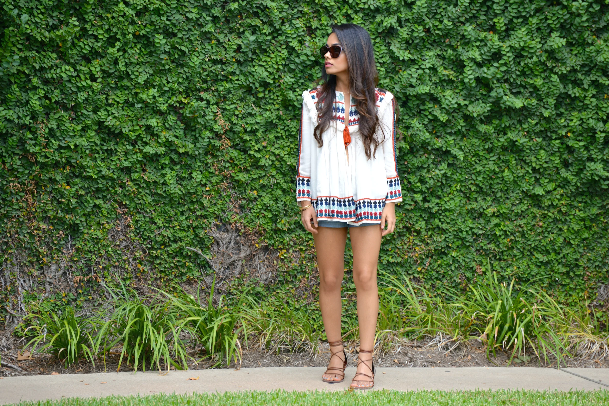 I am soo excited that summer decided to hang around for a few more days in Houston! I purchased this top a few months ago and it was unbearably hot to wear it back then. I am so happy that the weather is not too hot during the day to rock this gorgeous embroidered top! I love the colors and the pattern on this top and the fact that it is pretty warm makes it a perfect piece to transition into fall. Although this is technically a jacket, I just threw it on as a top and paired it with denim cut-offs. I suggest wearing a bandeau top underneath, as the jacket is open in the front.