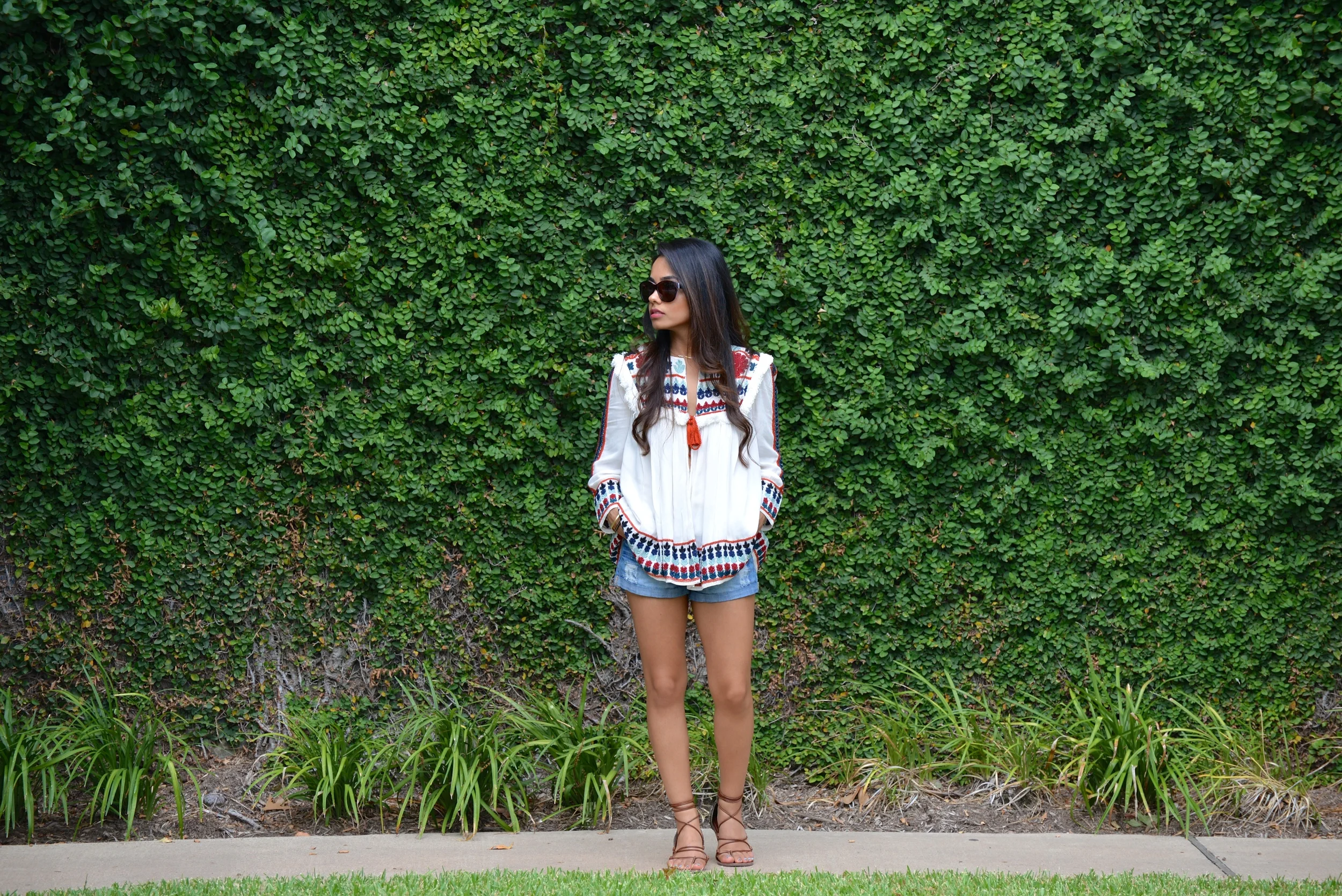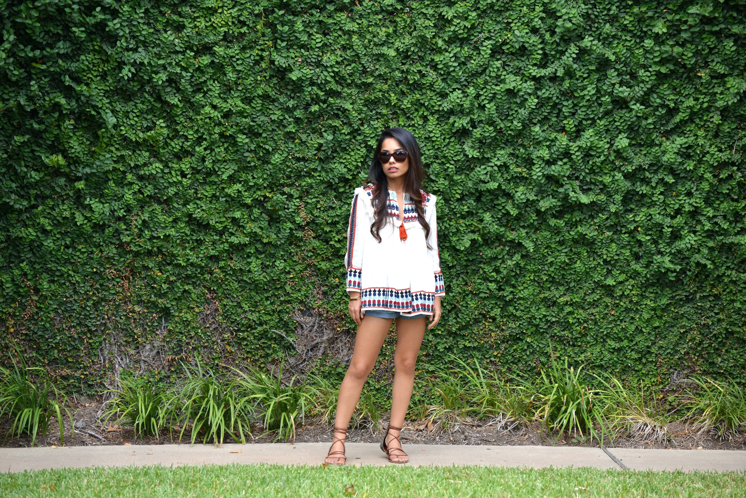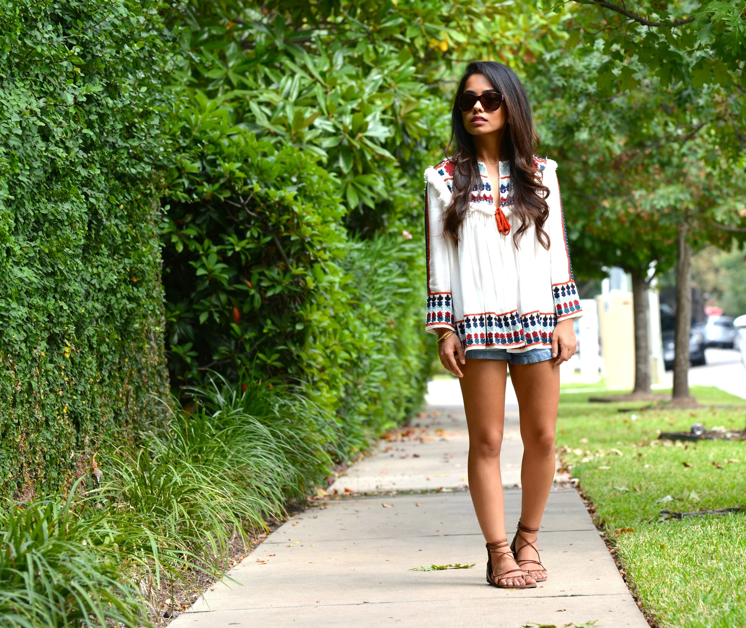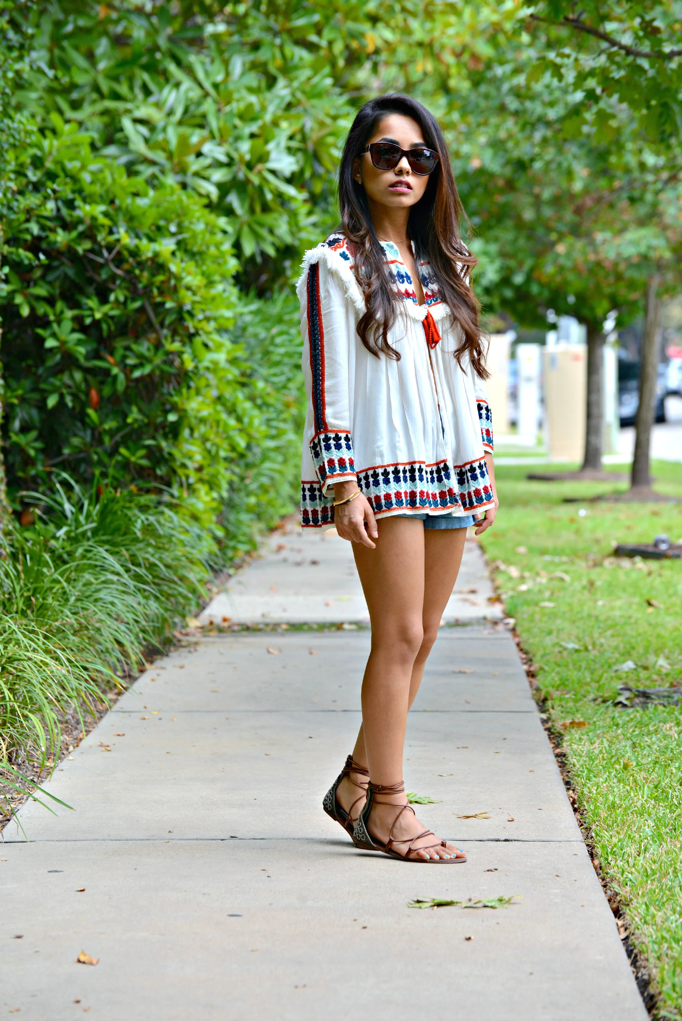 I am soo excited that summer decided to hang around for a few more days in Houston! I purchased this top a few months ago and it was unbearably hot to wear it back then. I am so happy that the weather is not too hot during the day to rock this gorgeous embroidered top! I love the colors and the pattern on this top and the fact that it is pretty warm makes it a perfect piece to transition into fall. Although this is technically a jacket, I just threw it on as a top and paired it with denim cut-offs. I suggest wearing a bandeau top underneath, as the jacket is open in the front.
