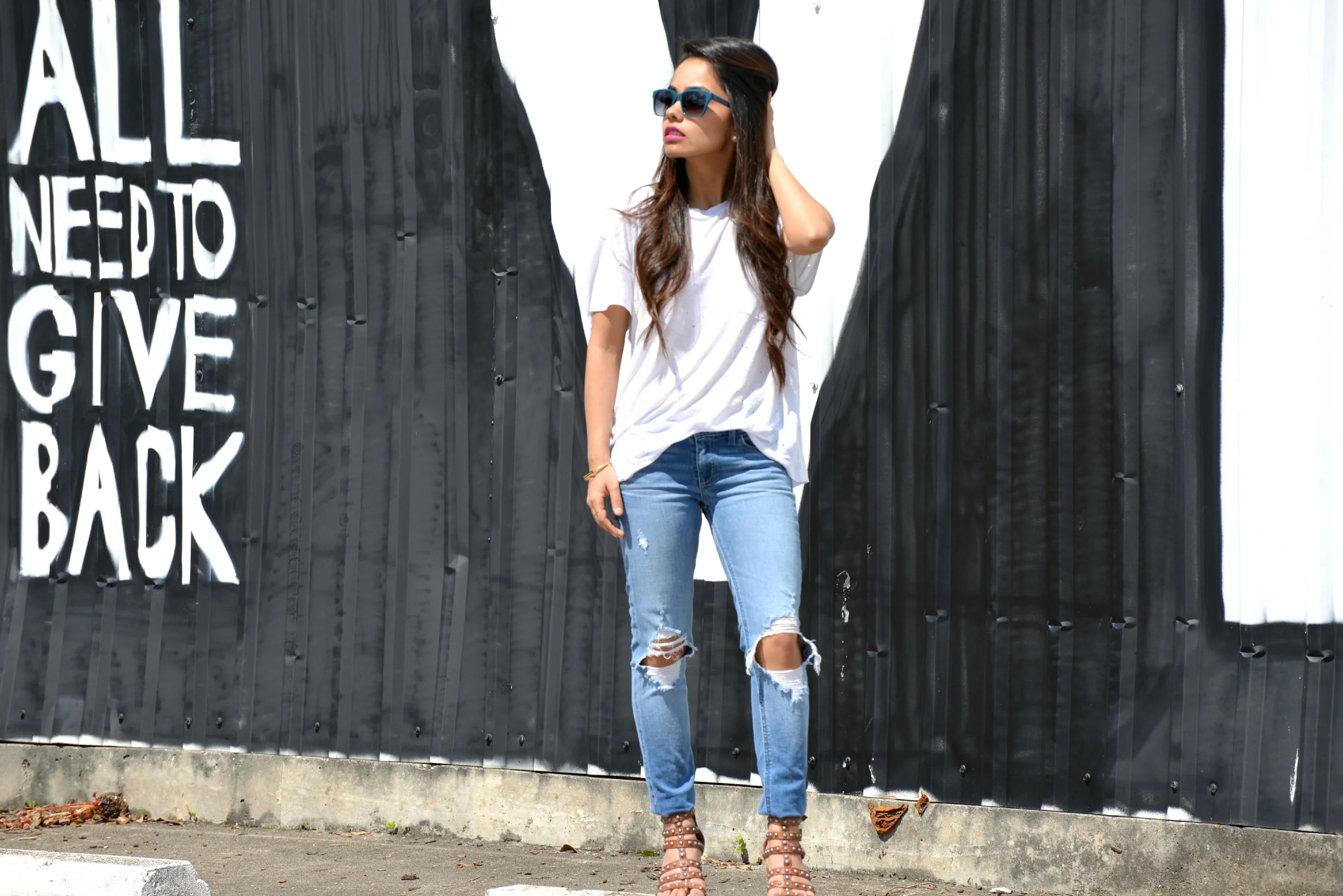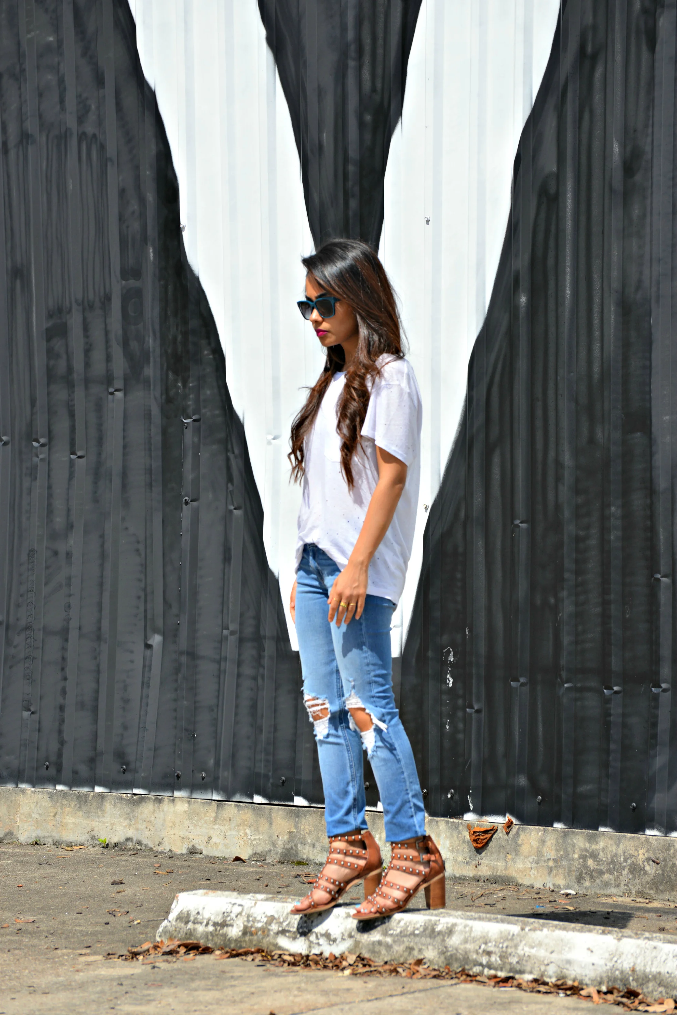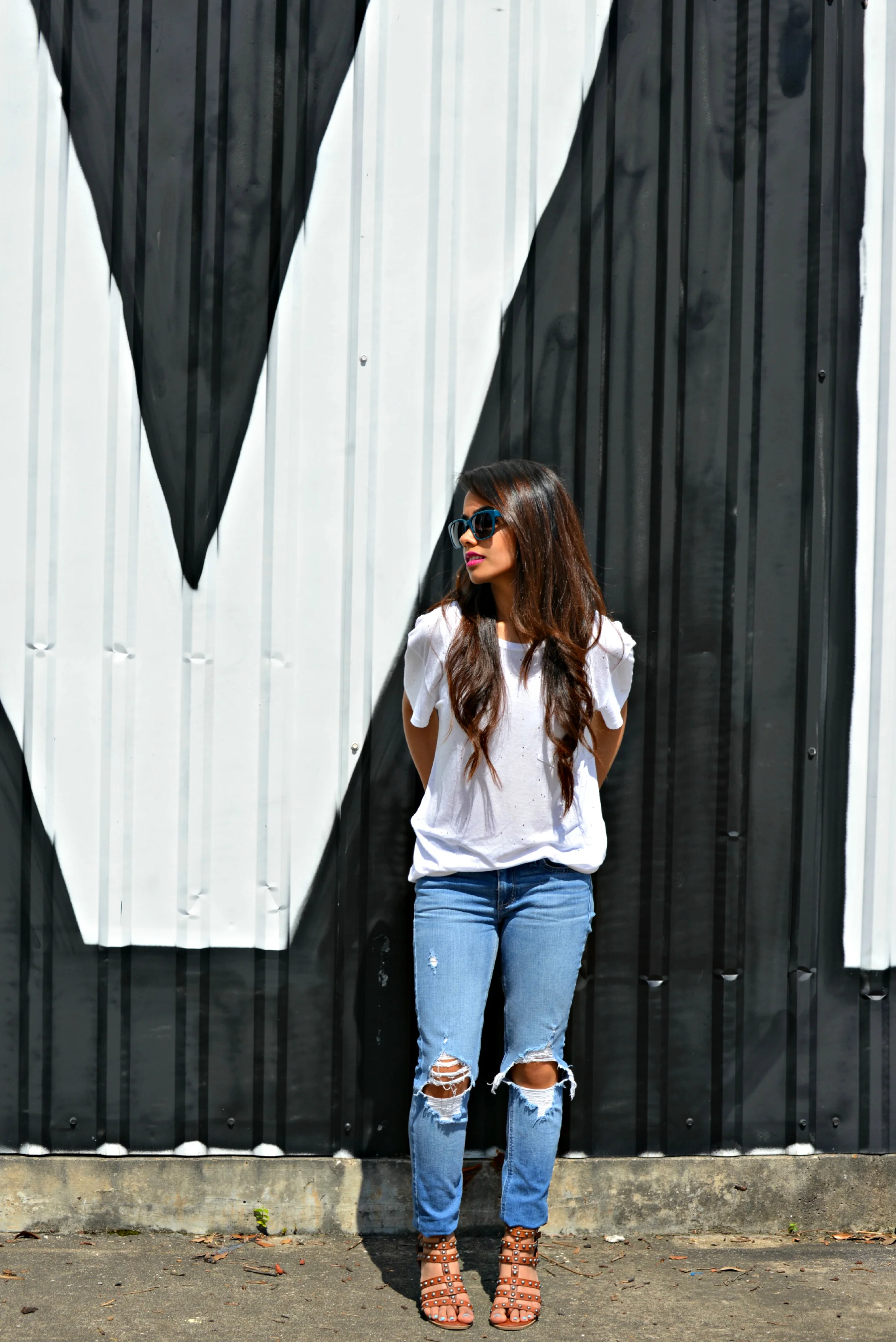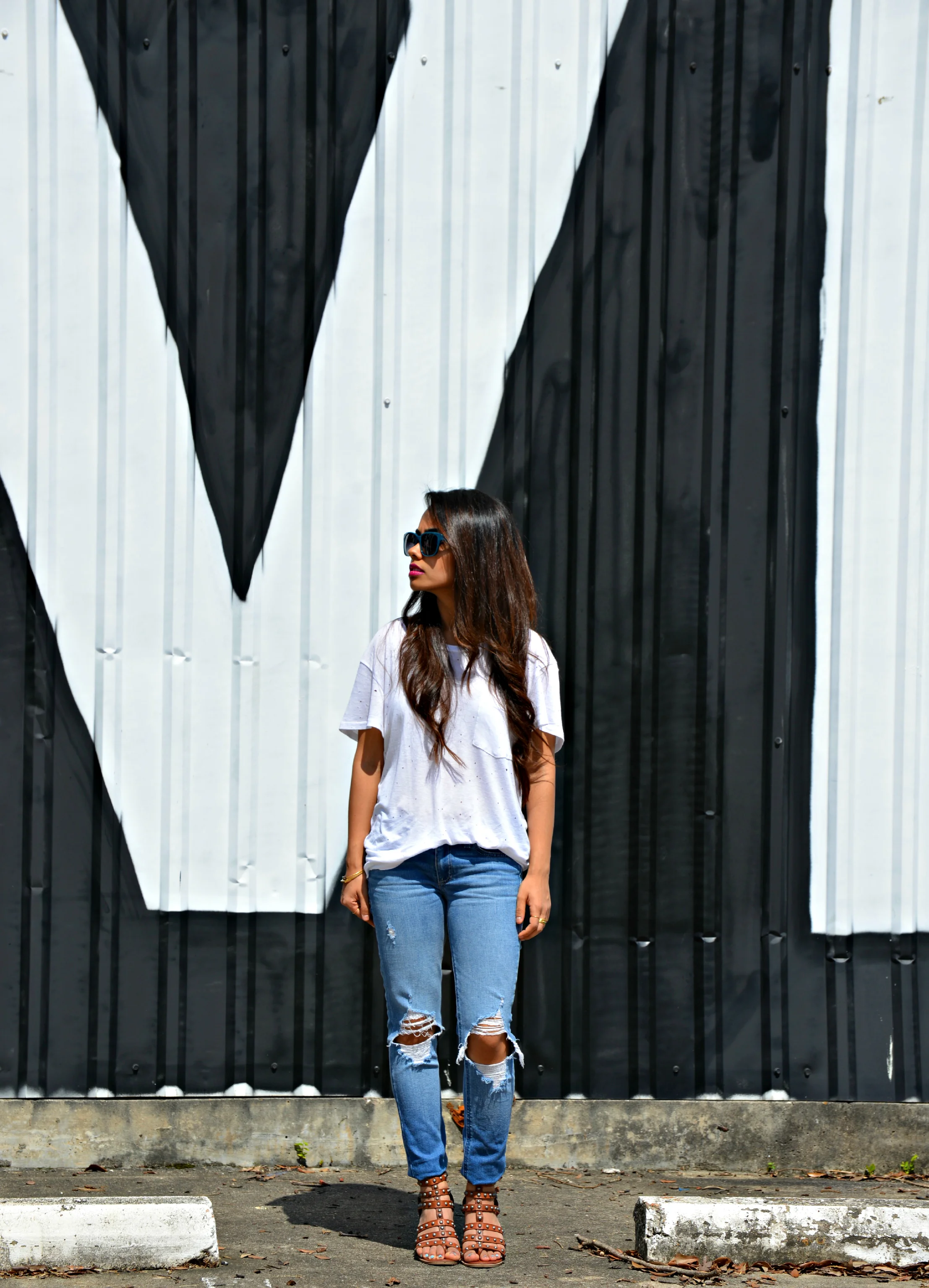 I am so happy it is finally Thursday because of the long weekend! Somehow the weeks just keep getting longer and longer, and the hours between Monday and Friday are beginning to multiply (maybe that’s a bit dramatic, but some weeks are just way too long). I shot this outfit a few weekends ago and I am finally getting around to posting it. I rarely ever ever ever wear pants in the summer, because well I live in Houston and there is no such thing as a mild summer. However, I am absolutely in love with these ripped jeans so I made an exception. I surprisingly found these jeans at Hollister where I haven’t shopped at since high school. I absolutely love ripped jeans and they are defiantly challenging to find for shorter people so I pretty much look everywhere, even in the kids section. I was very surprised that these jeans fit so perfectly, mainly because they are cropped and they fit like full-length jeans on me.