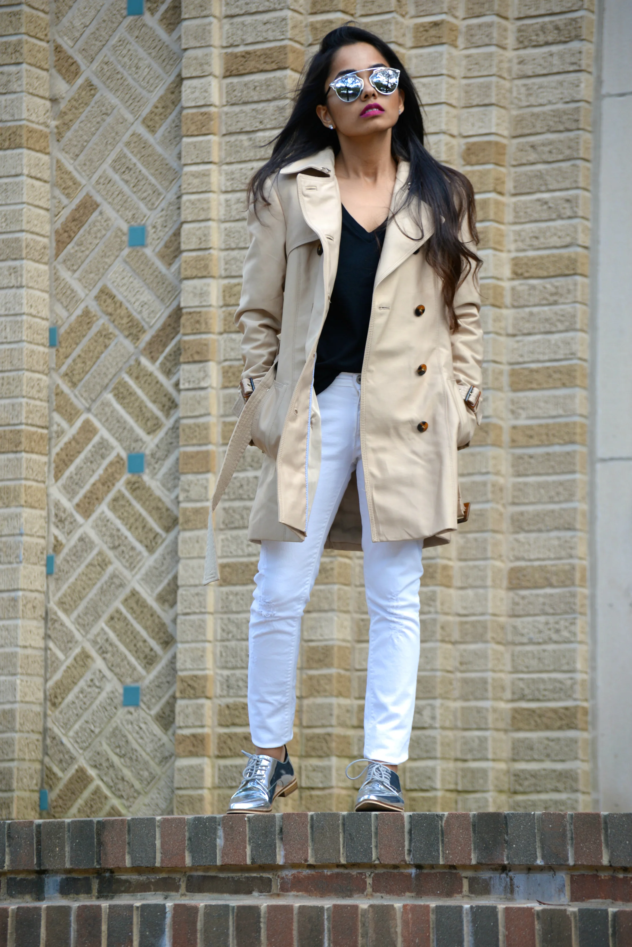 I wore this trench a few weeks ago when the weather was a bit cooler with ripped skinny jeans and a plain black tee. I wanted to keep the outfit very simple and chic. I also added metallic loafers, as these are one of my new favorite flats! They are so fun and definitely are a staple for spring. The loafers are also pretty comfortable and reasonably priced!