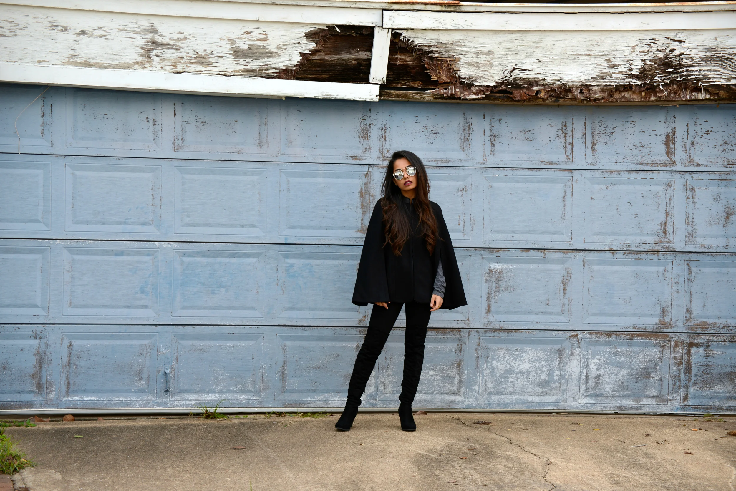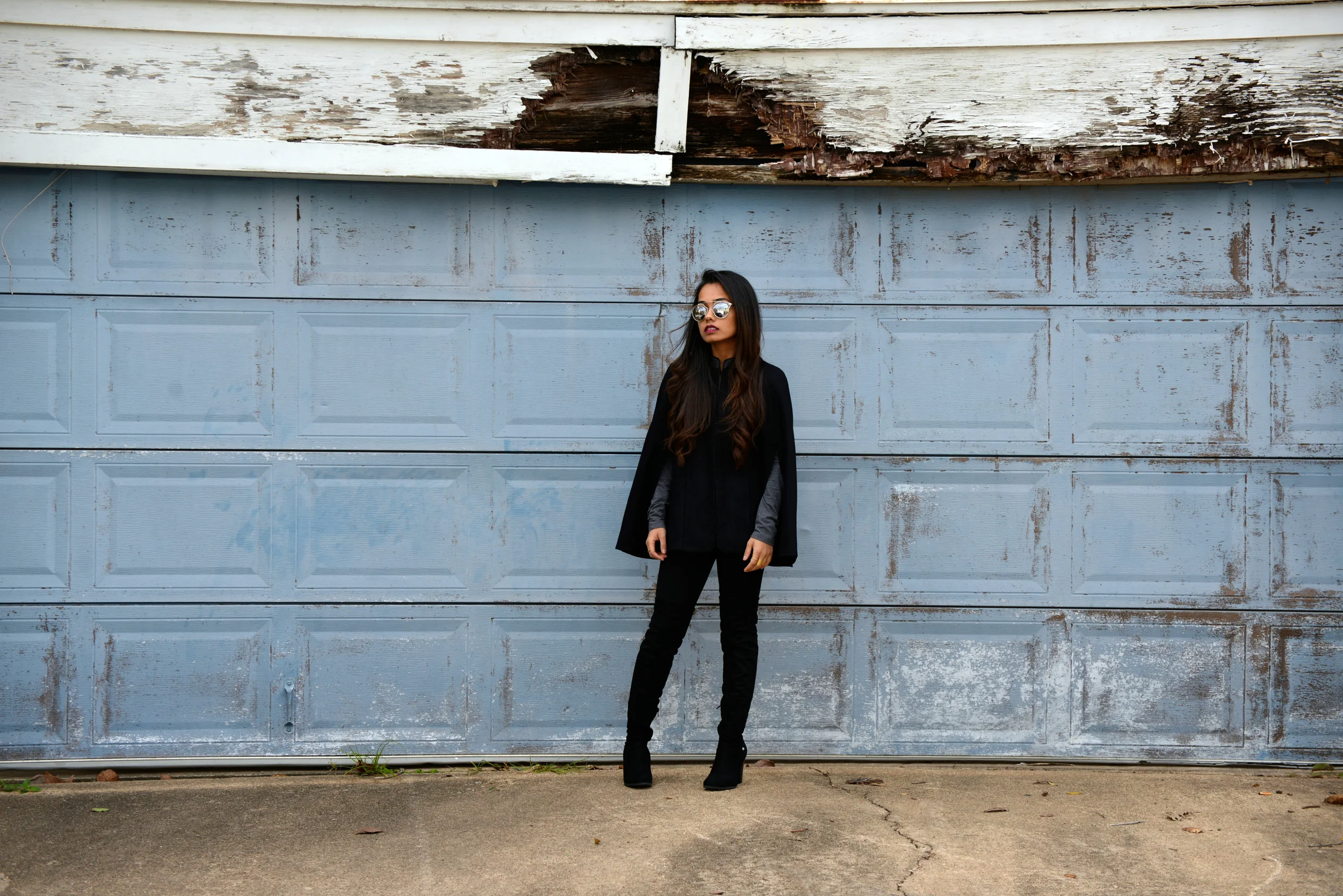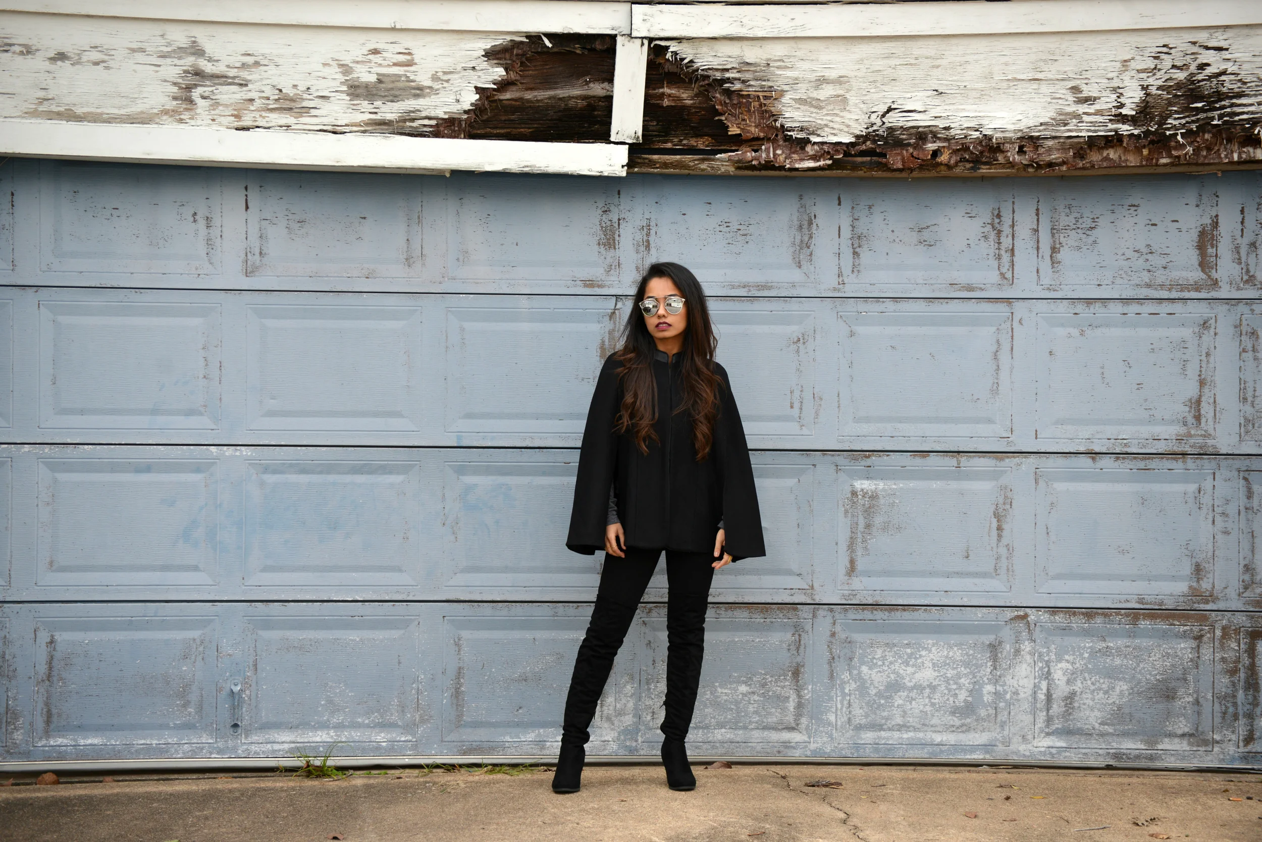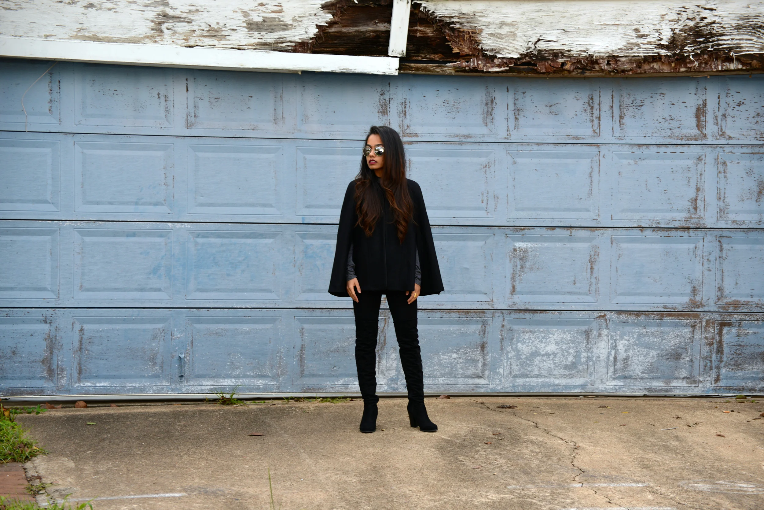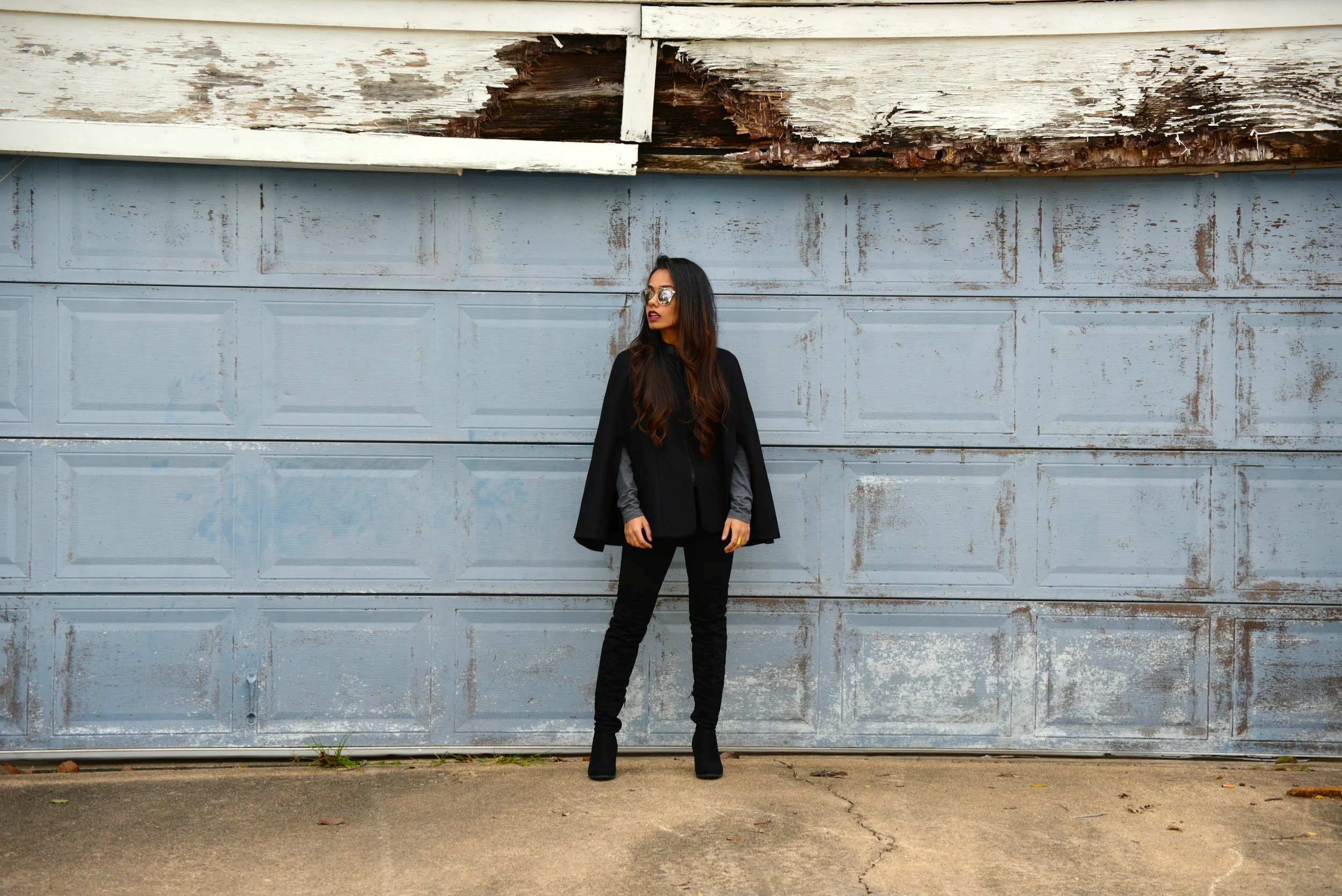 I decided to pair this coat with tights and over the knee boots. I also wanted to keep the look very grey and black toned so I added a lightweight grey full sleeve shirt. You can easily pair a tall cape coats with a dress (for winter and spring) or jeans with boots or pumps for a more chic look.